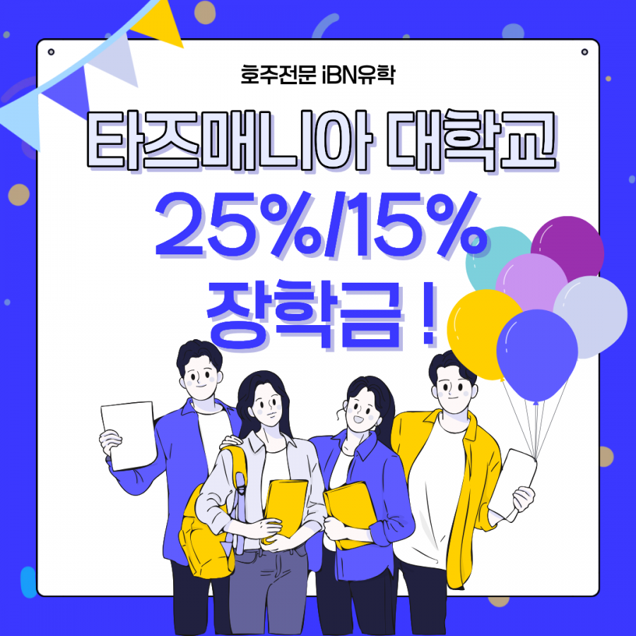 안녕하세요 iBN유학 입니다. 최근 업데이트된 타즈매니아 대학교 유학생 장학금 소식 전달 드리겠습니다. 장학금 1) Tasmania International Scholarship (TIS) - 25% 성적우수 장학금 (2026 & 2027년 제공) - 장학금 헤택: 전체 과정 학비의 25% 감면 - 지원 대상: 타즈매니아 대학교 풀타임 학위과정 지원하는 모든 국제학생 - 심사 방식: 입학 지원 시 자동 성적 심사 후 결과 통지 (입학 기준 대비 약 10-15% 상위 성적일 경우 가능) ※ TIS 장학금 자격은 지원자가 해당 과정 시작 전 취득한 학력 중, 최소 1년 이상 이수한 가장 높은 최종 학력을 기준으로 심사 됩니다. ※ 장학금 제외 전공: 의대, 치매치료, AMC 항해과정(자체 장학금 별개 제공) 장학금 2) Early Acceptance Scholarship (EAS) - 15% 장학금 (2026년 제공) - 지원 대상: 2026년 7월학기(Semester 2) 입학 예정자 - 지원 마감: 2026년 4월 13일 - 오퍼 수락 & 디포짓 납부 마감: 2026년 4월 27일 ※ 2026년 2월학기 입학 예정자였다가 오퍼 수락 완료 후 2학기로 연기한 경우도 적용 가능 ※ 장학금 제외 전공: 응용과학학사(항해과학/해양공학), 물리치료석사, 언어병리학석사, 작업치료석사, 정보기술 및 시스템석사, 경영학석사, 전문회계학석사 장학금은 심사 후, 가장 높은 장학금 1개로 적용이 되며, EAS의 경우 올해 시작까지만 확정이기에 타즈매니아 대학교 장학금 및 전공학기 등 관련해서 더 궁금하신 부분은 태즈매니아대학교(UTAS) 공식 파트너 에이전시인 iBN유학으로 문의주시길 바랍니다. <iBN유학 호주 시드니본사 셀리나 차장> - 직통 카카오톡: SerenaK - 이메일: selina@ibnedu.com